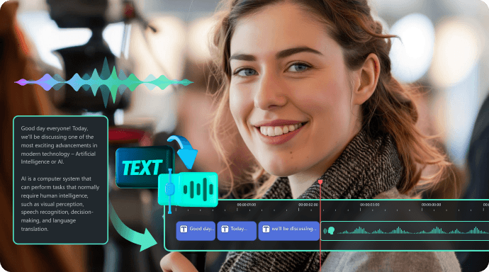 descargar Filmora, introducir el texto, elegir la voz y el idioma y dejar que Filmora la convierta