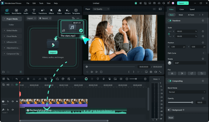 Import your own audio files and merge it with your video. Or simply drag and drop the audio into the Audio track from our built-in music & SFX library.
